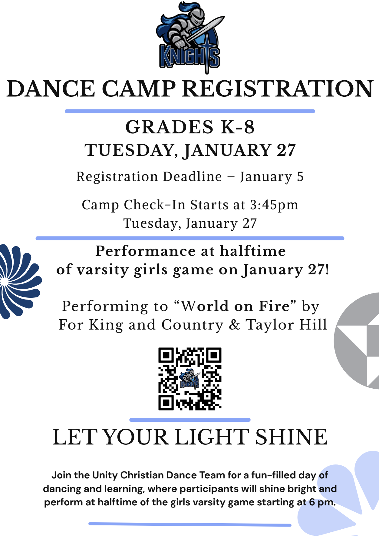 The Unity Christian Dance Team is excited to be hosting our annual Kids Dance Camp on January 27, 2026 this year! Camp is for students grades Kindergarten through 8th. Register by January 5th HERE.