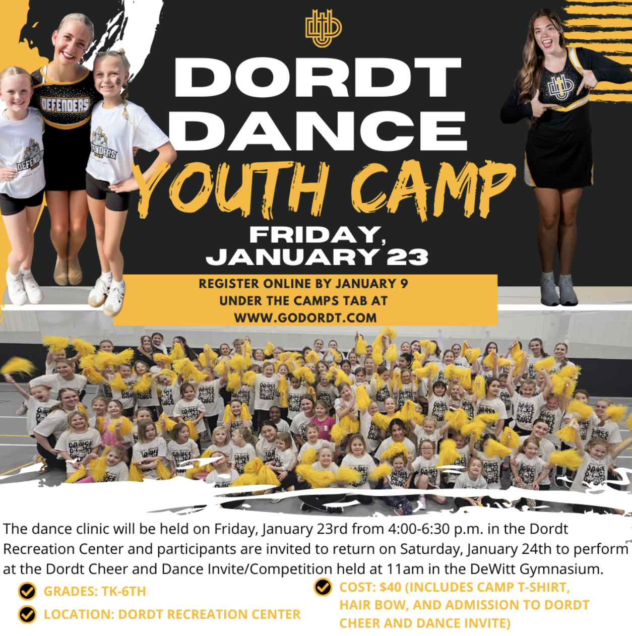 The Dordt University Dance Team is hosting a Youth Dance Camp on Friday, January 23rd from 4:00-6:30pm for students in TK-6th grade. Students can register online by going to this link: https://godordt.com/registrations/#!/camp/158. Registrations are due by January 9 to guarantee their spot and t-shirt size.
