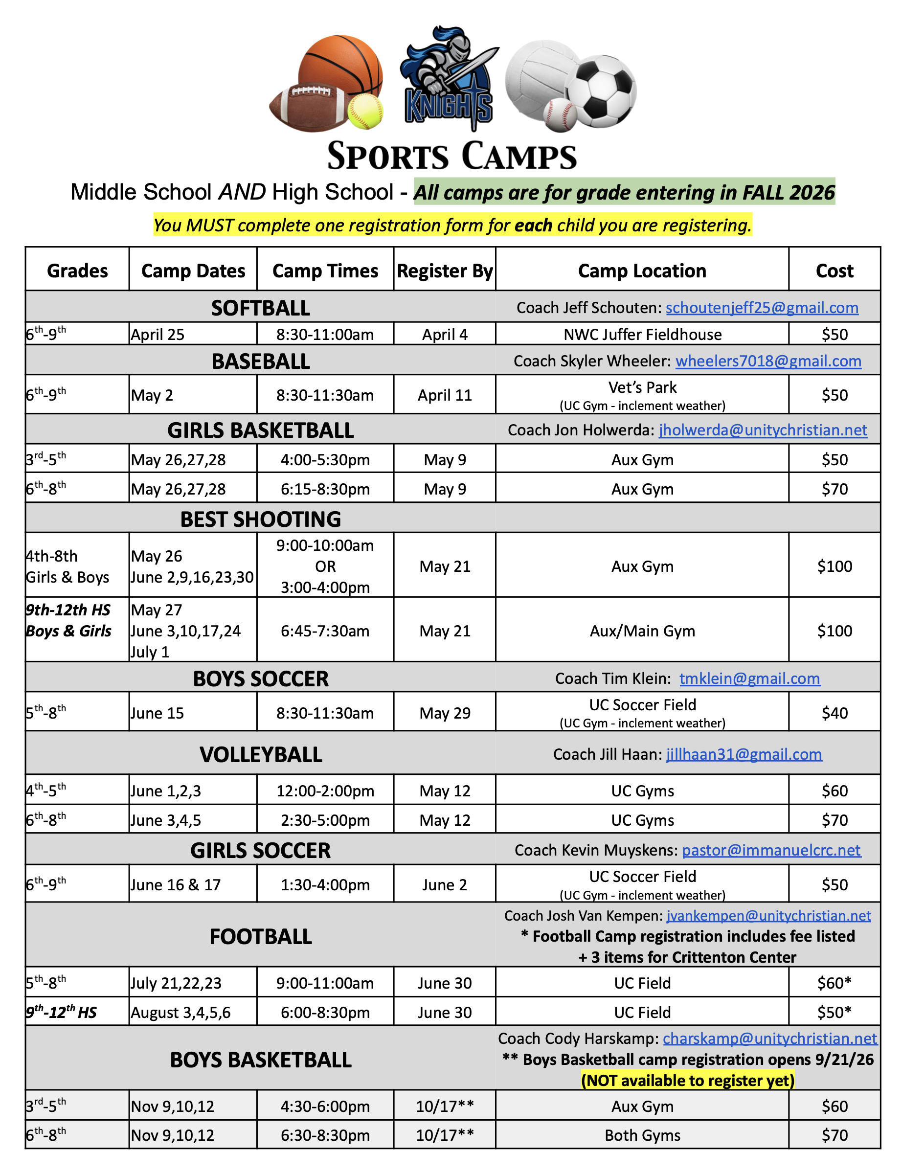 Unity is excited to offer a wide variety of sports camps throughout the year, giving athletes opportunities to grow their skills, compete, and have fun. With many camp options available, there’s something for everyone.